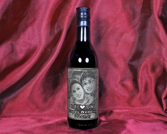 商品介紹: 中酒雕-影像雕刻:照片經由設計師影像處理後,將人物影像及文字邊框刻於187ml法國進口紅酒上面。